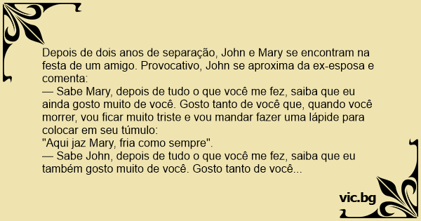 — Sabe Mary, depois de tudo o que você me fez, saiba que eu ainda gosto muito de você. Gosto tanto de você que, quando você morrer, vou ficar muito triste e vou mandar fazer uma lápide para colocar em seu túmulo: