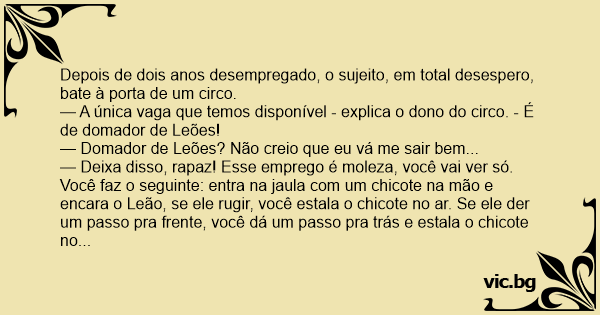 — Deixa disso, rapaz! Esse emprego é moleza, você vai ver só. Você faz o seguinte: entra na jaula com um chicote na mão e encara o Leão, se ele rugir, você estala o chicote no ar. Se ele der um passo pra frente, você dá um passo pra trás e estala o chicote no ar. Se ele der dois passos pra frente, você dá dois passos pra trás e estala o chicote no ar novamente. Se ele avançar de novo, você recua e estala o chicote no ar... é fácil...