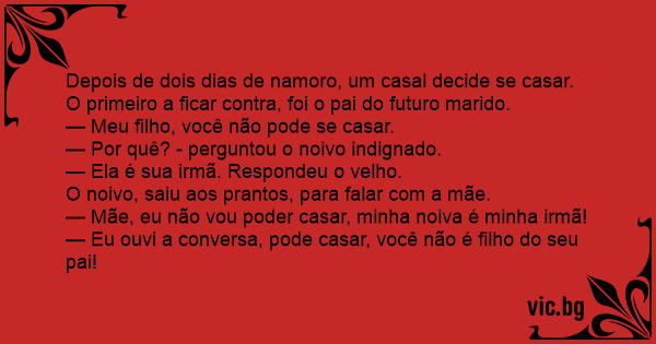 Depois de dois dias de namoro, um casal decide se casar. O primeiro a ficar contra, foi o pai do futuro marido.