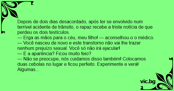 Depois de dois dias desacordado, após ter se envolvido num terrível acidente de trânsito, o rapaz recebe a triste notícia de que perdeu os dois testículos.