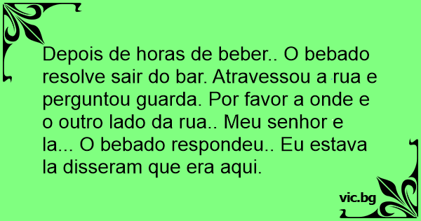 Depois de horas de beber.. O bebado resolve sair do bar. Atravessou a rua e perguntou guarda. Por favor a onde e o outro lado da rua.. Meu senhor e la... O bebado respondeu.. Eu estava la disseram que era aqui.