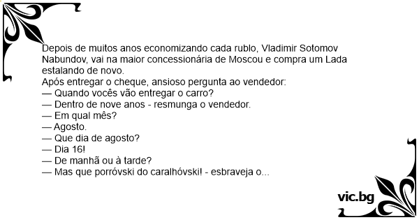 Depois de muitos anos economizando cada rublo, Vladimir Sotomov Nabundov, vai na maior concessionária de Moscou e compra um Lada estalando de novo.