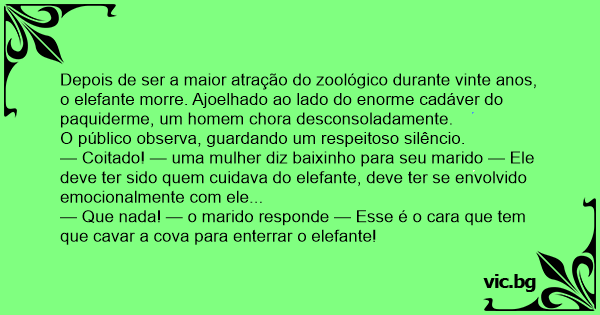 — Que nada! — o marido responde — Esse é o cara que tem que cavar a cova para enterrar o elefante!