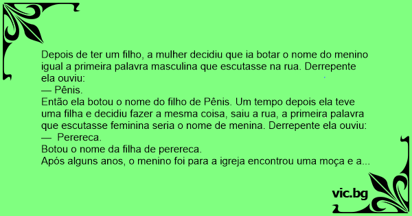 Então ela botou o nome do filho de Pênis. Um tempo depois ela teve uma filha e decidiu fazer a mesma coisa, saiu a rua, a primeira palavra que escutasse feminina seria o nome de menina. Derrepente ela ouviu: