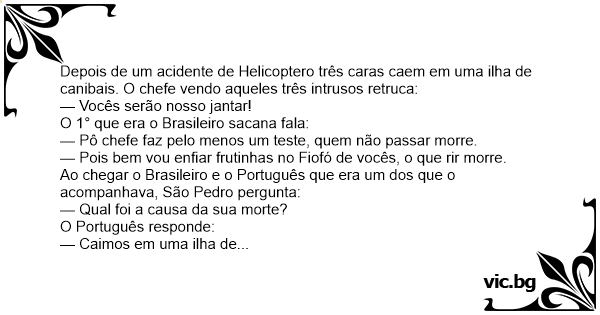 Foram parar em uma ilha, um Americano, um Brasileiro, e um Português. Chegaram os canibais da ilha e disseram: — Uga uga,para vocês ficarem aqui tem que procurar duas frutas e infincar no rabo e se...