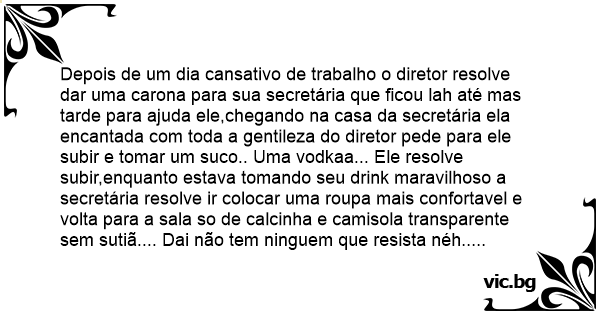 Depois de um dia cansativo de trabalho o diretor resolve dar uma carona para sua secretária que ficou lah até mas tarde para ajuda ele,chegando na casa da secretária ela encantada com toda a gentileza do diretor pede para ele subir e tomar um suco.. Uma vodkaa... Ele resolve subir,enquanto estava tomando seu drink maravilhoso a secretária resolve ir colocar uma roupa mais confortavel e volta para a sala so de calcinha e camisola transparente sem sutiã.... Dai não tem ninguem que resista néh.. O diretor transou com a secretária a noite inteira loucamenteeee.... Quando deu uma 4 horas da manha ele olhou no relogio e precisou sair correndo para a sua casa... Mais antes de sair pediu um giz para a mulher e colocou ele atrás da orelha... Chegando em casa ele começou a conta para a mulher que estava bravissima: