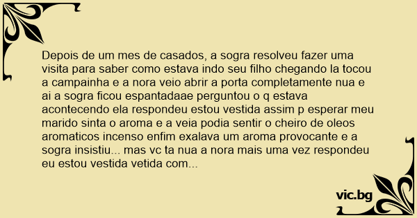 Depois de um mes de casados, a sogra resolveu fazer uma visita para saber como estava indo seu filho chegando la tocou a campainha e a nora veio abrir a porta completamente nua e ai a sogra ficou espantadaae perguntou o q estava acontecendo ela respondeu estou vestida assim p esperar meu marido sinta o aroma e a veia podia sentir o cheiro de oleos aromaticos incenso enfim exalava um aroma provocante e a sogra insistiu... mas vc ta nua a nora mais uma vez respondeu eu estou vestida vetida com o vestido do amor e assim q seu filho gosta q eu o receba... a veia decidiu ir embora sem mesmo esperar o filho ... xegando em casa fez o mesmo qdo o marido xegou em casa perguntou q e isso mulher ta variando ? ela respondeu naum eu estou vestida com o vestido do amor.... o velho respondeu precisa passar ferro cade meu jantar ta pronto