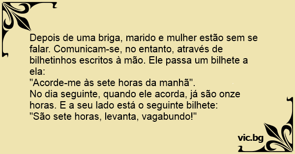 Depois de uma briga, marido e mulher estão sem se falar. Comunicam-se, no entanto, através de bilhetinhos escritos à mão. Ele passa um bilhete a ela: