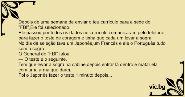 Ele passou por todos os dados no currículo,cumunicaram pelo telefone para fazer o теsте de coragem e tinha que cada um levar a sogra.