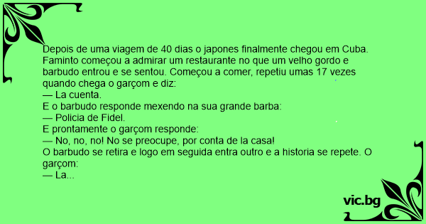 Depois de uma viagem de 40 dias o japones finalmente chegou em Cuba. Faminto começou a admirar um restaurante no que um velho gordo e barbudo entrou e se sentou. Começou a comer, repetiu umas 17 vezes quando chega o garçom e diz: