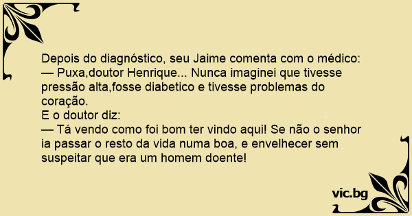 — Puxa,doutor Henrique... Nunca imaginei que tivesse pressão alta,fosse diabetico e tivesse problemas do coração.