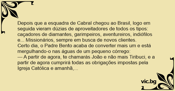 — A partir de agora, te chamarás João e não mais Tiribuci, e a partir de agora cumprirá todas as obrigações impostas pela Igreja Católica e amanhã, Sexta-feira Santa, não comerás carne, somente peixe!