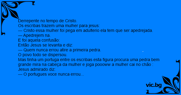 Mas tinha um portuga entre os escribas esta figura procura uma pedra bem grande mira na cabeça da mulher e joga poooww a mulher cai no chão :