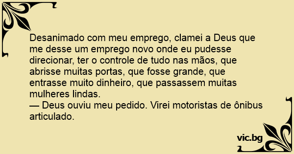 Desanimado com meu emprego, clamei a Deus que me desse um emprego novo onde eu pudesse direcionar, ter o controle de tudo nas mãos, que abrisse muitas portas, que fosse grande, que entrasse muito dinheiro, que passassem muitas mulheres lindas.