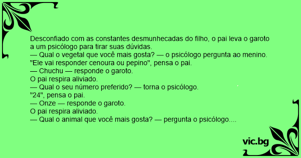 — Qual o vegetal que você mais gosta? — o psicólogo pergunta ao menino.