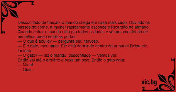 Desconfiado de traição, o marido chega em casa mais cedo. Ouvindo os passos do соrnо, a mulher rapidamente esconde o Ricardão no armário.