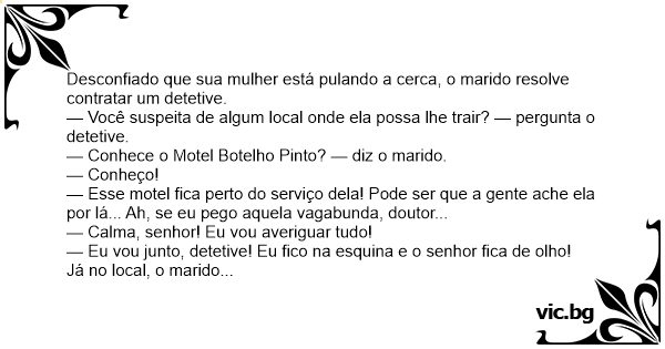 — Conhece o Motel Botelho Pinto? — diz o marido.