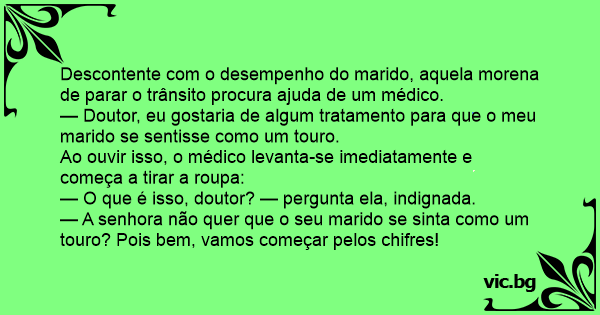 ¿Cómo poner al marido como un toro? Κερατάς Η κυρία και ο ταύρος. Una mujer desesperada le pide al Doctor: - Докторе, секса с мъжа ми вече не е същия, може ли да направите нещо, така че той да е като преди? - Разбира се, съблечете се. - Ама то не е за мен, нещо за него трябва. - Знам, ще го направя като БИК направо, съблечете се. - Ама... - Скъпа госпожо, искате бик, нека почнем с рогата ... - Sa dottore, non è per me, ma per mio marito, sembra che perda colpi, non riesce più a concludere niente. Mi aiuti… non so più cosa fare! - Si spogli signora. - Ma… è per mio marito, non per me! - Non si preoccupi signora… farò diventare suo marito un TORO!!! - Mi fa molto piacere dottore… ma…... - Panie doktorze... Mój mąż ma problemy w łóżku. Mógłby Pan coś zrobić, żeby znowu był jak byczek? - Proszę się rozebrać. - Rozebrać? - Tak, zaczniemy od rogów. Entra una mujer espectacular en una farmacia y le dice al boticario: - Buenos días, deme algo para que mi marido se ponga como un toro... Y el farmacéutico, ante tanta belleza, le responde: -... – Dottore, mio marito mi trascura; vorrei farlo tornare come un toro. – Bene si spogli! – Ma dottore, che dice? – Signora se vuole far tornare suo marito come un toro, incominciamo dalle corna! Uma mulher, toda boazuda, vai ao médico: - Doutor, queria que fizesse algo pelo meu marido...Algo que o deixasse ficar como um touro! - Pois bem, dispa-se e vamos começas pelos chifres.