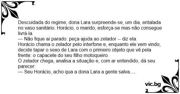 Descuidada do regime, dona Lara surpreende-se, um dia, entalada no vaso sanitário. Horácio, o marido, esforça-se mas não consegue livrá-la.