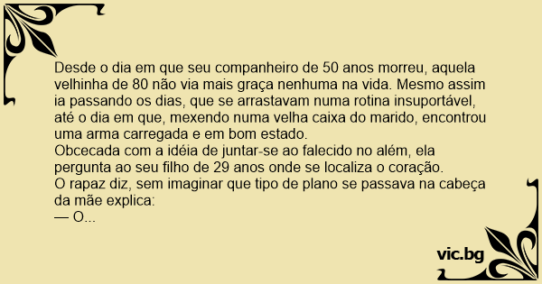 Desde o dia em que seu companheiro de 50 anos morreu, aquela velhinha de 80 não via mais graça nenhuma na vida. Mesmo assim ia passando os dias, que se arrastavam numa rotina insuportável, até o dia em que, mexendo numa velha caixa do marido, encontrou uma arma carregada e em bom estado.