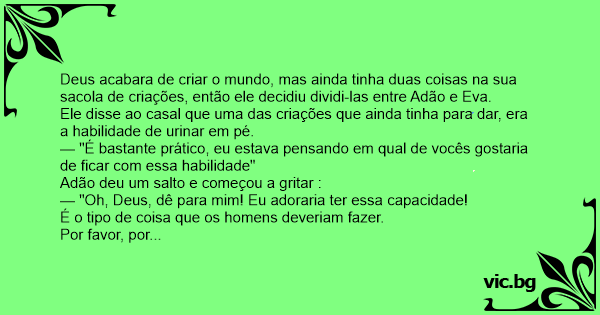 Diante de tanta excitação, Eva apenas sorriu e disse a Deus que se realmente Adão fazia tanta questão, se era o tipo de coisa que o deixaria tão feliz, que ele deveria ganhar a capacidade de fazer xixi em pé.