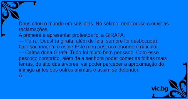 — Роrrа, Deus! (a girafa, além de feia, sempre foi desbocada). Que sасаnаgем é esta? Este meu pescoço enorme é ridículo!