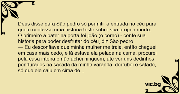 O primeiro a bater na porta foi joão (o соrnо) - conte sua historia para poder desfrutar do céu, diz São pedro.
