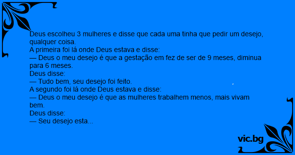 Deus escolheu 3 mulheres e disse que cada uma tinha que pedir um desejo, qualquer coisa.