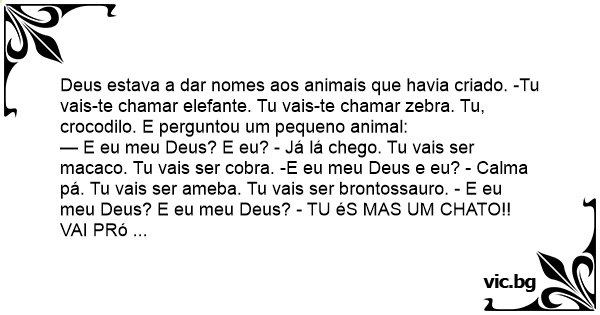 — E eu meu Deus? E eu? - Já lá chego. Tu vais ser macaco. Tu vais ser cobra. -E eu meu Deus e eu? - Calma pá. Tu vais ser ameba. Tu vais ser brontossauro. - E eu meu Deus? E eu meu Deus? - TU éS MAS UM CHATO!! VAI PRó ...