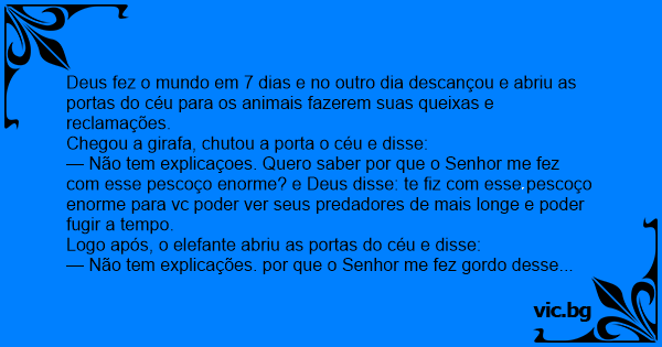 Deus fez o mundo em 7 dias e no outro dia descançou e abriu as portas do céu para os animais fazerem suas queixas e reclamações.
