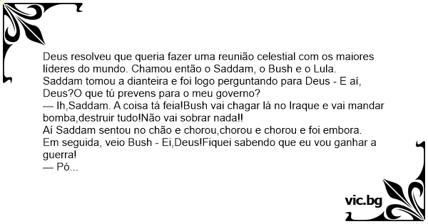 Deus resolveu que queria fazer uma reunião celestial com os maiores líderes do mundo. Chamou então o Saddam, o Bush e o Lula.