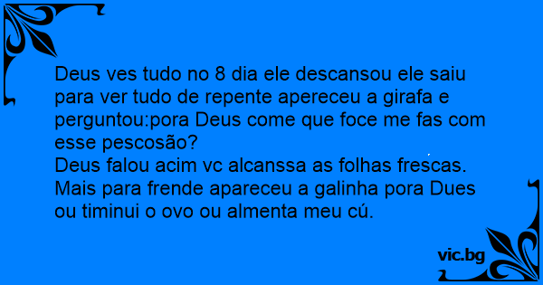 Deus ves tudo no 8 dia ele descansou ele saiu para ver tudo de repente apereceu a girafa e perguntou:pora Deus come que foce me fas com esse pescosão?