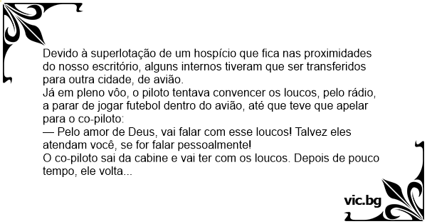Já em pleno vôo, o piloto tentava convencer os loucos, pelo rádio, a parar de jogar futebol dentro do avião, até que teve que apelar para o co-piloto: