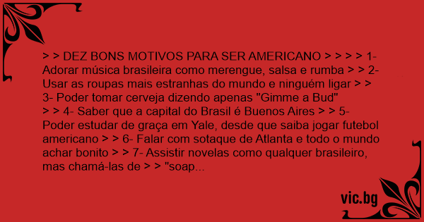 > > DEZ BONS MOTIVOS PARA SER AMERICANO > > > > 1- Adorar música brasileira como merengue, salsa e rumba > > 2- Usar as roupas mais estranhas do mundo e ninguém ligar > > 3- Poder tomar cerveja dizendo apenas "Gimme a Bud"