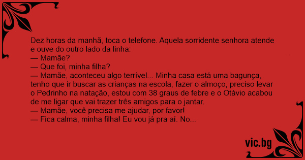 — Mamãe, aconteceu algo terrível... Minha casa está uma bagunça, tenho que ir buscar as crianças na escola, fazer o almoço, preciso levar o Pedrinho na natação, estou com 38 graus de febre e o Otávio acabou de me ligar que vai trazer três amigos para o jantar.