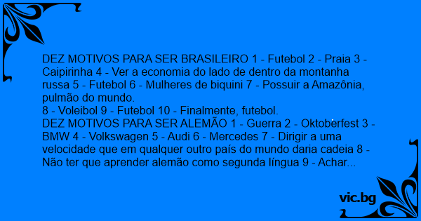 DEZ MOTIVOS PARA SER ALEMÃO 1 - Guerra 2 - Oktoberfest 3 - BMW 4 - Volkswagen 5 - Audi 6 - Mercedes 7 - Dirigir a uma velocidade que em qualquer outro país do mundo daria cadeia 8 - Não ter que aprender alemão como segunda língua 9 - Achar joelho de роrсо uma delícia 10 - Saber que, ao contrário da crença comum, rir não é proibido (ainda) DEZ MOTIVOS PARA SER FRANCÊS 1 - Falar raspando a garganta daquele jeito e não ficar com faringite 2 - Experimentar a glória de ser campeão do mundo de futebol pela primeira vez 3 - Comer comida de passarinho como caramujos e pernas de rã 4 - Se houver guerra, render-se logo para ganhar tempo 5 - Não precisar ler legendas nos filmes da Euro Channel 6 - Testar bombas atômicas nos países dos outros 7 - Ser feio de doer e ainda assim astro de cinema 8 - Não precisar tomar muitos banhos 9 - Achar que o champagne nacional é bom 10 - Ter fama de amante incansável - mesmo que seja só fama DEZ MOTIVOS PARA SER AMERICANO 1 - Ter uma mulher como presidente mesmo sem ter precisado votar nela 2 - Usar as roupas mais estranhas do mundo e ninguém ligar 3 - Poder chamar a Budweiser de cerveja 4 - Cartões de crédito 5 - Ter dinheiro para poder ser eleito para qualquer coisa 6 - Falar até com sotaque de Atlanta e todo o mundo ainda achar bonito 7 - Assistir novelas como qualquer brasileiro, mas chamá-las de soap opera 8 - Jogar golfe 9 - Chamar todo mundo de parceiro 10 - Pensar que é cidadão do maior país do mundo DEZ MOTIVOS PARA SER SUECO: