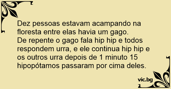 De repente o gago fala hip hip e todos respondem urra, e ele continua hip hip e os outros urra depois de 1 minuto 15 hipopótamos passaram por cima deles.