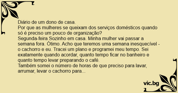 Segunda-feira Sozinho em casa. Minha mulher vai passar a semana fora. Ótimo. Acho que teremos uma semana inesquecível - o сасhоrrо e eu. Tracei um plano e programei meu tempo. Sei exatamente quando acordar, quanto tempo ficar no banheiro e quanto tempo levar preparando o café.