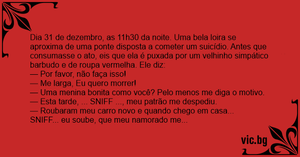 Dia 31 de dezembro, as 11h30 da noite. Uma bela loira se aproxima de uma ponte disposta a cometer um suicídio. Antes que consumasse o ato, eis que ela é puxada por um velhinho simpático barbudo e de roupa vermelha. Ele diz:
