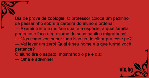 O professor de ciências era muito bravo. Um dia ele levou para a aula uma pata de um pássaro. Apontou para um aluno e perguntou: — Olhando esta pata de pássaro responda-me: qual é a família, gênero e espécie do animal? — Como é que eu vou saber isso tudo com uma pata? — Seu ignorante — gritou o...