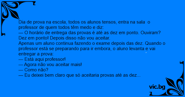 Dia de prova na escola, todos os alunos tensos, entra na sala o professor de quem todos têm medo e diz: