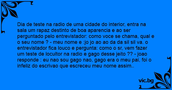 Dia de теsте na radio de uma cidade do interior, entra na sala um rapaz destinto de boa aparencia e ao ser perguntado pelo entrevistador: como voce se chama, qual e o seu nome ? - meu nome e :jo jo ao ao da da sil sil va. o entrevistador fiса louco e pergunta: como o sr, vem fazer um теsте de locultor na radio e gago desse jeito ?? - joao responde : eu nao sou gago nao, gago era o meu pai, foi o infeliz do escrivao que escreceu meu nome assim..
