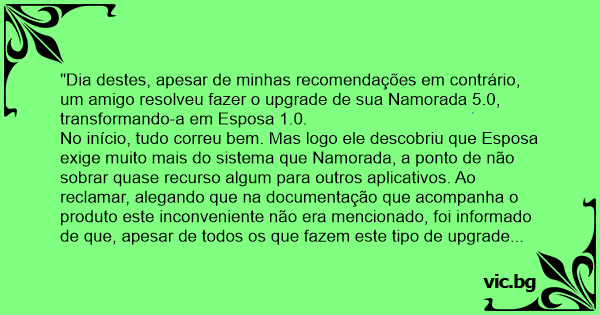 "Dia destes, apesar de minhas recomendações em contrário, um amigo resolveu fazer o upgrade de sua Namorada 5.0, transformando-a em Esposa 1.0.