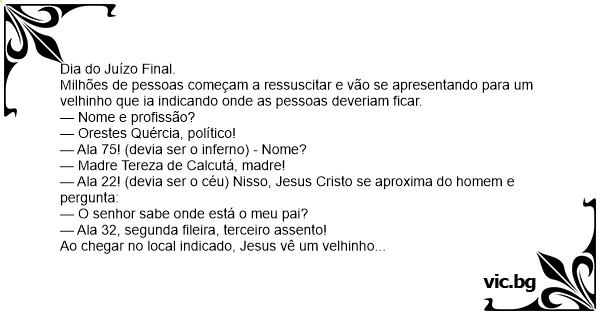— Ala 22! (devia ser o céu) Nisso, Jesus Cristo se aproxima do homem e pergunta: