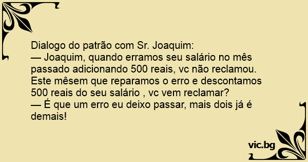 — Joaquim, quando erramos seu salário no mês passado adicionando 500 reais, vc não reclamou. Este mêsem que reparamos o erro e descontamos 500 reais do seu salário , vc vem reclamar?