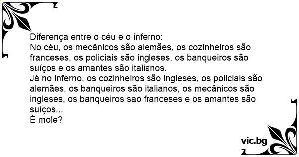 Já no inferno, os cozinheiros são ingleses, os policiais são alemães, os banqueiros são italianos, os mecânicos são ingleses, os banqueiros sao franceses e os amantes são suíços...