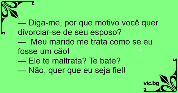 -Dígame ¿Cuál es el motivo por el quiere divorciarse de su esposo? - Mi marido me trata como si fuera un perro. - ¿La maltrata... le pega? - ¡No! ¡Quiere que le sea fiel!