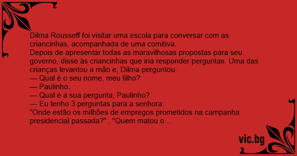 Depois de apresentar todas as maravilhosas propostas para seu governo, disse às criancinhas que iria responder perguntas. Uma das crianças levantou a mão e, Dilma perguntou: