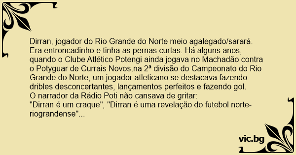 . E era Dirran prá cá, Dirran pra lá … No final do jogo, o Clube Atlético Potengi perdeu por 3 x 1, mas o destaque daquele jogo foi o jogador Dirran. Vendo aquele sucesso todo do jogador atleticano, um jovem repórter da Rádio Poti foi fazer uma entrevista com o craque na beira do gramado e foi logo perguntando: