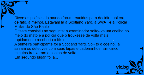 O теsте consistiu no seguinte: o examinador solta- va um coelho no meio do mato e a polícia que o trouxesse de volta mais rapidamente receberia o título.